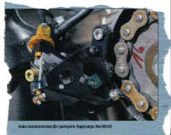 Die Kupplung begegnet der Drehmomentstärke durch starke Federn. Dank einer besonders pfiffigen Betätigung der Kupplung über eine Kniehebelmechanik halten sich die Handkräfte dennoch in erfreulichen Grenzen (auch bei Heru, siehe Foto Seite 153). Genial, wie gut sich die Kupplung damit dosieren lässt. Klar, dass so ein Motor der kurz übersetzten, schlanken Mende-VTR ganz schön Beine macht. Eine BremboBremsanlage mit Radial-Handpumpe vernichtet den Speed sauber dosierbar, die Beläge brauchen aber ordentlich Betriebstemperatur für beste Bissigkeit
