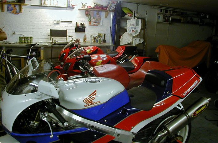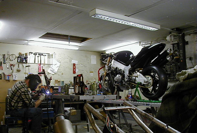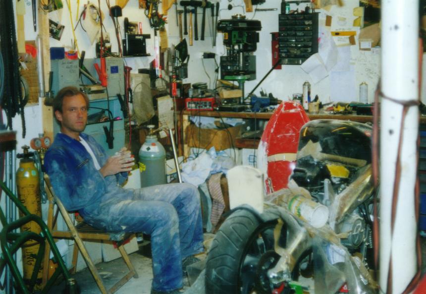 History :it began with slight Modyfications ,RC 30 BW - Front , rear Seat Duc 888 . First Carbon Silencer 1990 in mothers oven (Sorry mother ! ).First cuttings at rear Frame and wire , then engines Power up -- a great Step . Meanwhile a degree of Chemistry (dropped out ) , following : degree of Philosophy (main :Kant , but i'll drop out too ).