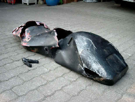 The crashprotectors have been bent,but not teared up,not even the fixing-spot of engine is damaged,radiators survived,also cpl. electronics,and-most important: the underseat fueltank.Imagine what would have happened,if you'd have a Carbon Fueltank in std. Location