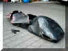 finished.When i add the weights : 1:Fueltank dummy 900 gr (1.980 lbs) You can express it many ways now,maybe:whole assembly is 2.5 kg (5.5 lbs) less than only the std. Fueltank.Or 800 gr (1760 lbs) less than only one std.Can.Or: hah-much better: THE WHOLE ITEMS MENTIONED ABOVE TOGETHER HAVE NEARLY SAME WEIGHT AS YOUR STD. BATTERY ! A Note:it's no Problem for me to copy the std. Fueltank in Carbon , Carbon/Kevlar or whatever,but it's a Question of how much you're tired of Life.Who already had a crash will know.I've got many Inquirys here in Germany from all the crashed guys ,the've damaged the Fueltank first ( 50% is caused by the crap shape).But even if you choose a maybe 8 cm smaller shape in width the risk will stay-and you'll burn.That's because there is a chance still sitting or be in contact with the Bike while the Fueltank hits the Ground-Carbon will tear up then. So-where i've located the Fueltank (in the area below my Carbon Subframe),the Fueltank is really protected by mainframes brackets where you normally fix your std. Subframe.So if shit must happen you must be far away from the Fueltank,because before theres no chance the Fueltank can be damaged. Maybe today i demould the first Fueltank-when i've got all spots for fixing you get the Pics. |
