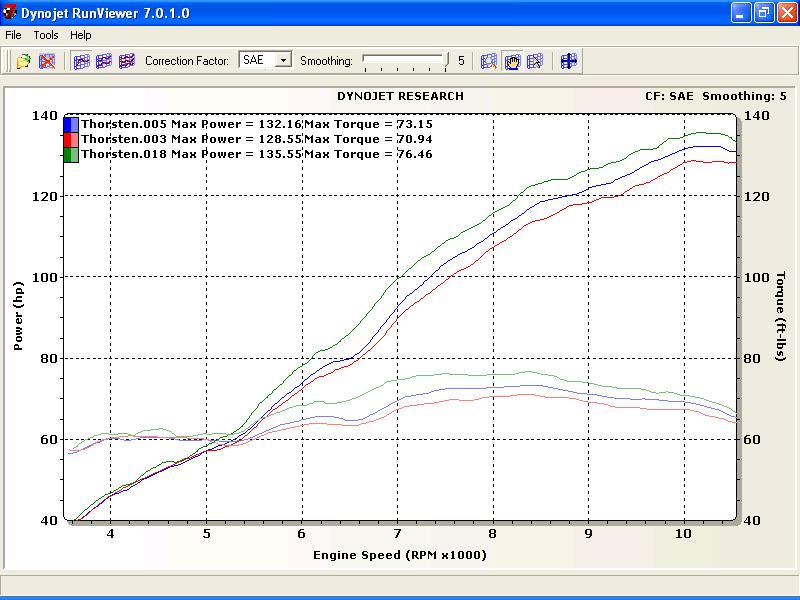 " This is a RC51 with a full Yosh exhaust, PC3 and Wiseco high-comp pistons. (running on VP Ultimate 4) The red line is with the standard airbox, the blue line is after the addition of a Thorsten Durbahn Airbox but without any remapping, and the green line is the Thorsten airbox with remapping. A worthwhile modification in my book."