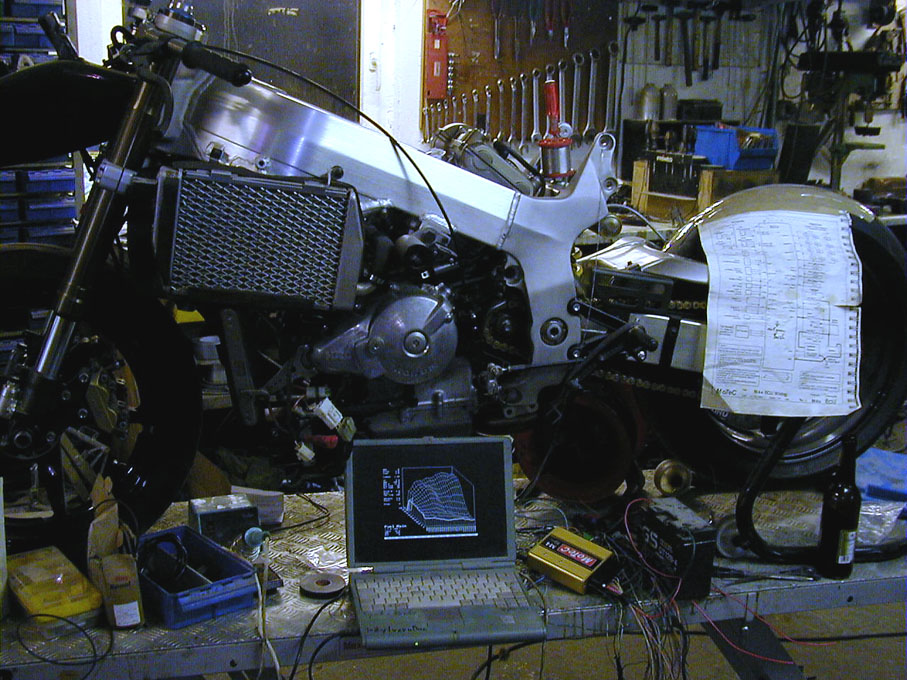 Got some first Impressions from my buddy a few days ago , test ride on street , he said , that the Bike is easily lifting front wheel on 2nd gear ( the Bike is not geared short ! ) , which has never happened before . Ok, I additional have installed my Race-Generator , but I do not assume , that only the Generator has such a huge effex , so - even his mapping needs to be slightly adjusted , what I've seen from the Data-recording -it looks like the swap to a fully programmable ECU was the way to go.