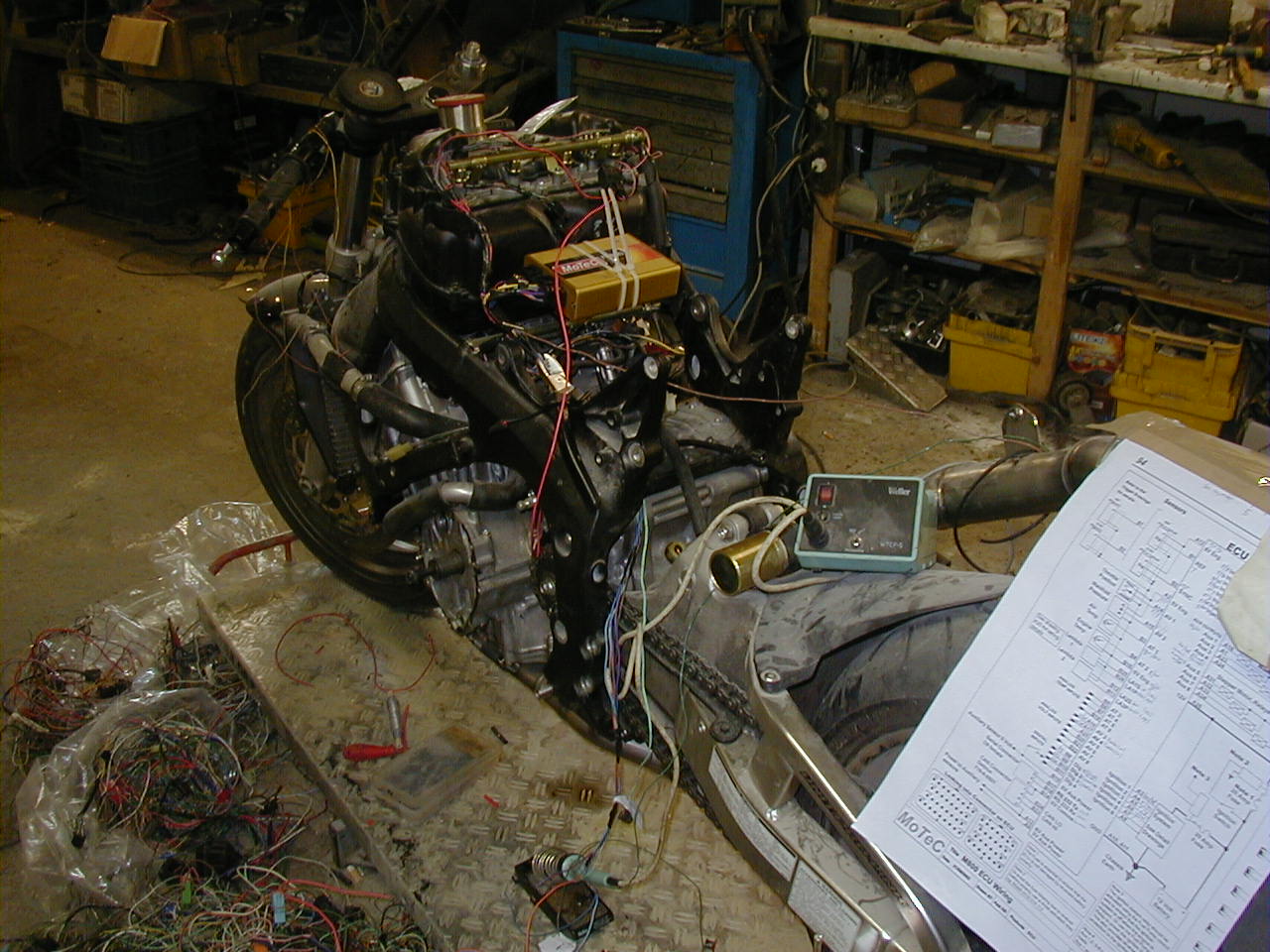 December 26/2006 : the Motec M4 wire harness for a buddy of mine is done , everything checked with a scope . Only the Quickshift-Assembly + Shiftlight needs to be mounted , then it's done . Such a work takes of course 2-3 days , but it's worth the work . This Time I've re-checked the Motec-adjustments for a OEM Alternator , before I installed the racing Alternator - to be sure 100% , that the crank Index Position would even work with a std. Alternator .
