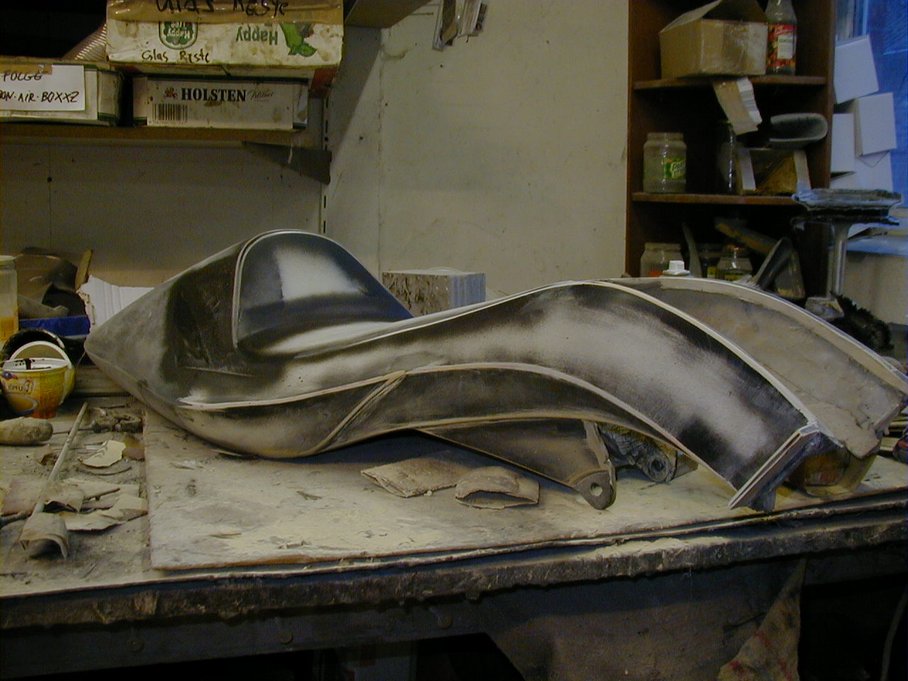 I'm not sure if I have ever shown or explained it here inside my web , but I'm searching the Picture-Gallery's on my Computer since a few days, and sometimes I detect something I estimate as worth to show up here . I.E. : the Engine-Breather/Airbox Solution I ride on my Bike.What you see here is 2nd Part I have shaped for my Airbox (all versions ), wich will be bond into the Airbox together with 4 gaskets ( Breather I + II , Oil-return-Breather and Atmosphere-exit ) . Inside this large Breather Box is a seperation-System for the Oil-Fog to condensate a flow back into the Engine .I have necer advertised this inside my Products-Section, because it's such a work with lots of different steps .